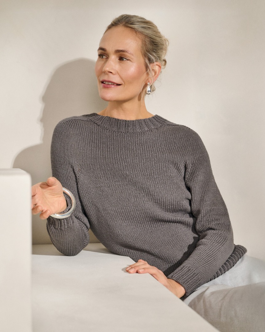 Dit model is afkomstig uit Classici 30 van Lana Grossa. De trui op de foto is gemaakt met rondbreinaalden van 4-5mm