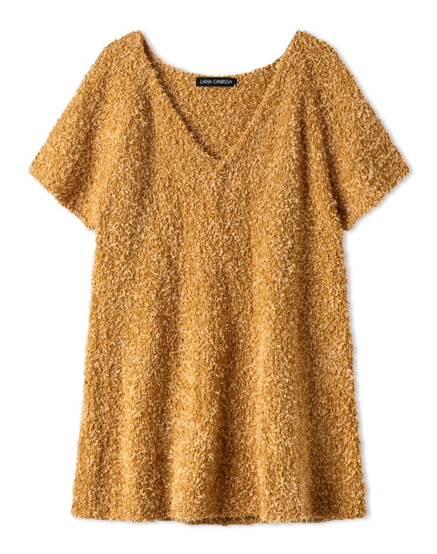 Dit model is afkomstig uit Nera 2 van Lana Grossa. De tuniek op de foto is aan een stuk gemaakt met kleur 2 op rondbreinaalden van 5mm.